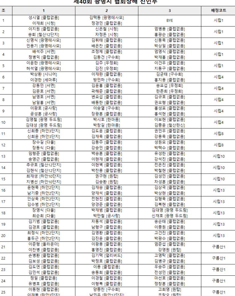 제40회 광명시 협회장배 신인부 출전하시는 선수분들께서는 배정 코트에서 출전신고하시기 바랍니다.